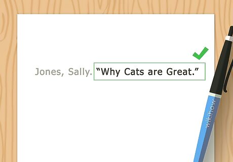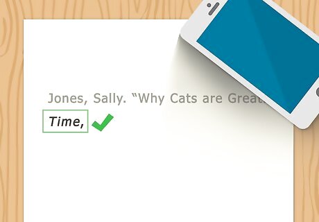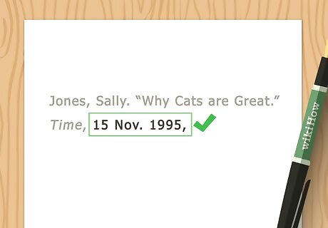Add the name of the publication after the article title. Italicize the name of the magazine or journal that your article appeared in. Follow that with a comma. For example: Jones, Sally. “Why Cats Are Great.” Time,