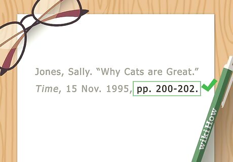 Add the article’s page range after its publication date. Format the page numbers by writing pp followed by a period, and then write the page range also followed by a period. For example: Jones, Sally. “Why Cats Are Great.” Time, 15 Nov. 1995, pp. 20-22. If you accessed this article in print, this is your full MLA magazine article citation!