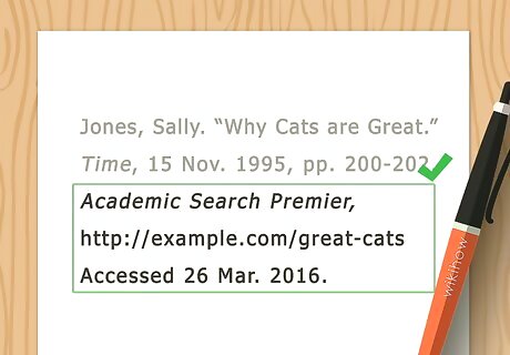 Add the database and URL after the page range. If you accessed the article digitally, write down the academic database where you found the article in italics followed by a comma. Then write the URL followed by a period and the date you accessed the materials. The date should be written as the word “Accessed,” the day of the month, the month abbreviated to 3 letters followed by a period, and then the year also followed by a period. For example: Jones, Sally. “Why Cats Are Great.” Time, 15 Nov. 1995, pp. 20-22. Academic Search Premier, https://akin.css.edu/login?url=http://time.com/5024401/why-cats-are-great. Accessed 26 Mar. 2016. MLA assumes that you access all your online articles through academic databases to ensure they are of scholarly merit.
