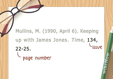 Write the issue and page numbers of the article after the title. Write the issue number of the magazine where your article appeared in italics, followed by a comma. Then write the page range the article spans unitalicized, followed by a period. For example: For example: Mullins, M. (1990, April 6). Keeping up with James Jones. Time, 134, 22-25. It’s not necessary to include a URL or digital reference when using this style guide. This is the finalized reference.