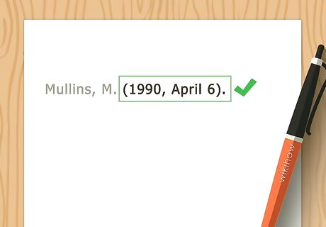 Create an in-text citation if needed. Cite a quote from the article in your essay by using an in-text citation. Write the citation as an open parenthesis, the author’s last name, a comma, the year of publication, a comma, p. and then the page number, followed by a closed parenthesis and a period. Place the in-text citation immediately after the quotation being cited. For example: He says, “Keeping up with James is a life’s work” (Mullins, 1990, p. 22). If you introduce the quote with the author’s name, include the publication year in parentheses after the name. Then, after the quote, put the p. and the page number in parentheses. For example: Mullins (1990) says that “keeping up with James is a life’s work” (p. 22).