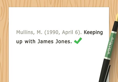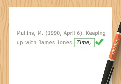 Italicize the name of the publication after the article title. Capitalize and italicize the name of the publication where the article you’re citing appeared. Follow that with a comma. For example: For example: Mullins, M. (1990, April 6). Keeping up with James Jones. Time, The name of the publication should appear in title case if it is more than 1 word.