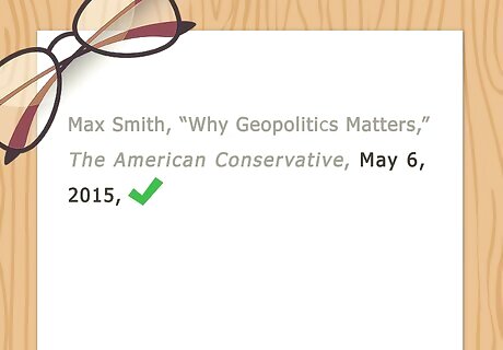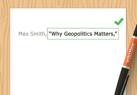 Place the article title after the author’s name. Format the article title using an open quotation mark, the title, a comma, and then a closed quotation mark. Put the title of the piece in title case. For example: Max Smith, “Why Geopolitics Matters,”