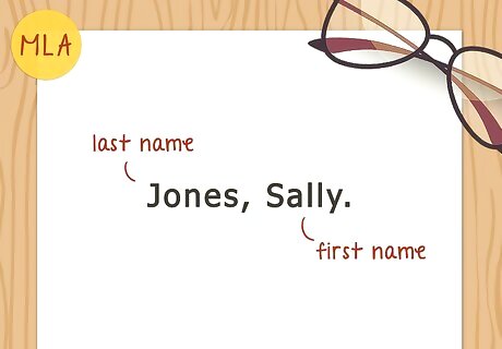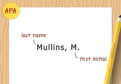 Write the author’s last name followed by the first initial. Write the author’s last name, followed by a comma, and then add the first initial followed by a period. If the author has a middle name, make that an initial as well. For example, Mike Mullins would become: Mullins, M. Mike Andrew Mullins III would become: Mullins, M. A., III.