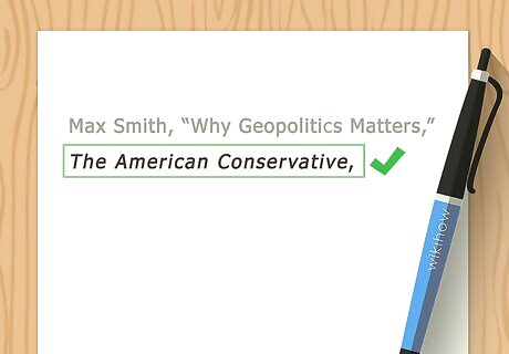 Italicize the name of the publication after the article title. Put the name of the publication in title case and follow it with a comma. For example: Max Smith, “Why Geopolitics Matters,” The American Conservative,
