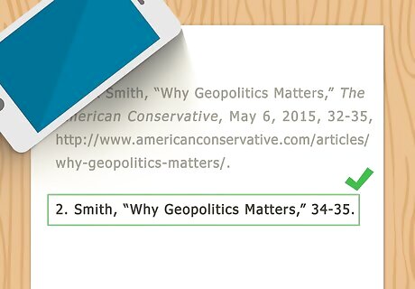Create secondary references, if needed. Use a secondary reference if you refer to the same magazine article citation multiple times. After the first full citation of the work, abbreviate subsequent citations to simply the author’s last name, a comma, the formatted title of the article, then the page numbers followed by a period. For example: Smith, “Why Geopolitics Matters,” 32. If your secondary reference is to a different page of an article that’s cited earlier, simply update the page number. For example, if your original citation cites page 32 of the Smith article, a secondary citation of pages 34-35 would look like this: Smith, “Why Geopolitics Matters,” 34-35.