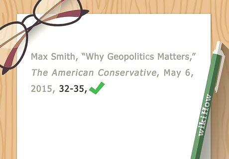 Add the page number after the article’s publication date. Write the page number as a numeral or range of numerals followed by a period. So, “[first/only page]-[last page].” For example, to cite one page: Max Smith, “Why Geopolitics Matters,” The American Conservative, May 6, 2015, 32. Or, to cite a range of pages: Max Smith, “Why Geopolitics Matters,” The American Conservative, May 6, 2015, 32-35. Unless you accessed the article online or in a database, this is the full citation.