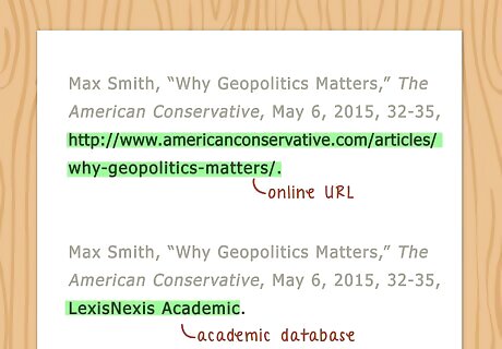 Include the URL or the database where you accessed the article. If you found your magazine article online or in an academic database, write that information after the article’s publication date. To accommodate the new information, the period following the date becomes a comma instead. Write the URL or database, and then add a period at the end of the citation. For example, in the case of a URL: Max Smith, “Why Geopolitics Matters,” The American Conservative, May 6, 2015, 32, http://www.theamericanconservative.com/articles/why-geopolitics-matters/. Or, in the case of a database: Max Smith, “Why Geopolitics Matters,” The American Conservative, May 6, 2015, 32, LexisNexis Academic. Chicago and Turabian only ask that you include either the URL or the database. You do not need to include both if you found the article in an academic database.