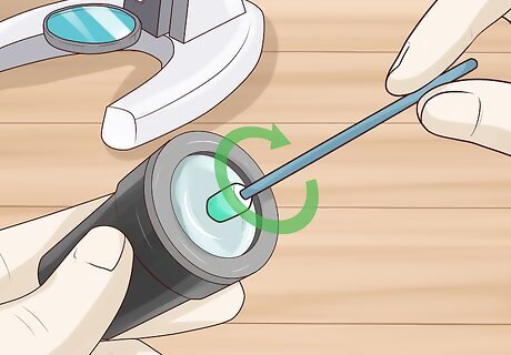 Scrub the center of the lens very gently with the swab. Move outwards with the cotton swab to clean the rest of the lens. Scrub in a circular motion, moving steadily away from the center of the lens and towards the periphery. Continue this motion until the entire lens is clean. Use a light hand in your scrubbing, since the lens is very easily damaged. Refrain from cleaning the lens by moving the cotton swab in straight lines. These may leave streaks or even scratches on the lens.