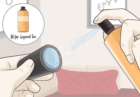 Spray oil-free compressed gas on the lenses to avoid damaging them. Using compressed air or gas is the best way to easily remove dust from your optical lenses if you don't have a dust brush or vacuum. However, do not use a compressed air product that contains solvents, as these will cause more harm than good to your lenses. For example, use dry-nitrogen propelled compressed air instead of an ordinary compressed air product (e.g., a keyboard cleaner).