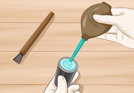Use a vacuum or dusting brush to clean dust off of the lenses. Since dust can be highly abrasive to your microscope, you need to remove it with great care. Gently brush the dust off with an optical dusting brush or vacuum specially designed for use with microscopes. You can buy this type of brush or vacuum at any store that sells microscopes and other laboratory equipment.