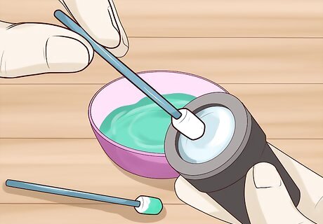 Dip the end of a lint-free cotton swab into a cleaning solution. This can be a solution of mild dish detergent and water or a pure grade of isopropyl alcohol. Be sure to only use lint-free cotton swabs, since lint may damage the optical lenses. You can buy these cleaning supplies at most stores that sell microscopes and other lab equipment. Avoid using a large cloth, if you can. Even if the cloth is lint-free, it will probably be too big to clean the lenses without spilling your cleaning liquid somewhere on the microscope.