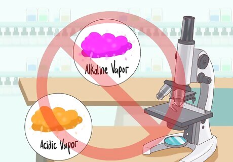 Keep the microscope away from acidic or alkaline vapors. These vapors are corrosive and might cause serious damage to your microscope. Avoid storing the microscope near a chemical photographic laboratory or any other source of corrosive vapors. Acidic and alkaline vapors are often produced during lab experiments in high school and college chemistry courses. Make sure to keep your microscope in a different room during these experiments.