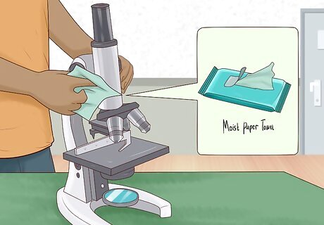 Unplug the microscope then wipe the outer frame with a moist paper towel. Since the outer frame is less susceptible to damage than the actual lenses of the microscope, it's fine to use a moist paper towel to remove any dust and dirt on the frame. Avoid touching the lenses with the paper towel or letting any of the water drip down into the lenses. For best results, use distilled water that doesn't contain any impurities that might inadvertently damage the microscope. Be sure to wipe down the microscope frame with a separate, dry paper towel to remove any excess moisture.