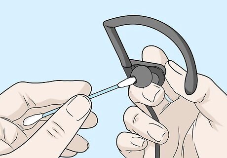 Scrub hard-to-reach gaps with a cotton swab. Apply a light amount of pressure as you clean with the cotton swab to remove any dirt that’s stuck on the surface. Focus on cracks or small gaps where dirt could collect, such as around the plastic ear tip or where the cords connect. Continue wiping your earphones until they look completely clean. Don’t insert the cotton swab into any charging ports on your Powerbeats since you could damage the internal electronics.Warning: Avoid rubbing the speaker mesh on the earphones with a cotton swab since small bits of fabric could get caught in it.