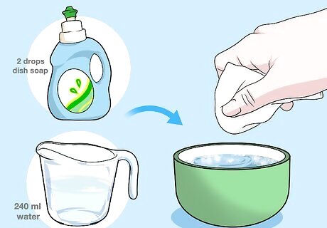 Wet a microfiber cloth with warm soapy water. Add 1 cup (240 ml) of warm water and 2–3 drops of liquid dish soap to a small bowl. Stir the water until it gets sudsy before dipping in your microfiber cloth. Wring out the cloth so it isn’t dripping wet. Avoid using a cloth that leaves lint since it could get stuck inside the eartips. Don’t use any harsh cleaning chemicals since it could weaken the plastic and ruin the eartips.