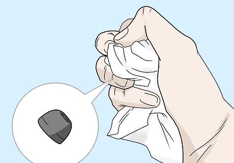 Wipe the eartips with the damp cloth to remove wax. Wrap your cloth around the eartips and rub them back and forth. Squeeze the eartips inside of the cloth to get rid of any wax that built up inside. Take the eartips out of the cloth every few seconds to see if they’re still dirty, and keep wiping them until they look clean. Be gentle while working with the eartips so you don’t accidentally damage or rip them.Variation: If you still see wax or dirt inside of the eartips, stick a damp cotton swab through them.
