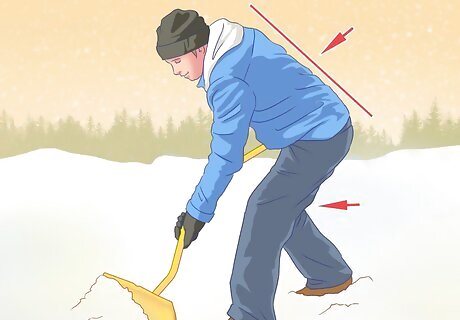 Shovel correctly to avoid hurting yourself. You can easily strain your back or knees when shoveling. However, there are ways to prevent this. It's important not to overload the shovel; work with manageable amounts of snow. Focus on pushing the snow instead of lifting it whenever possible, and take plenty of breaks. When you have to lift a load of snow, squat and lift using the power of your legs. Keep your back straight. Avoid jackknifing your body and lifting from your lower back, will save you from getting a back injury. Make sure the shovel is long enough. If you're trying to use a shovel that's too short for your height, you will increase the chances you will strain your back.You want to pick a shovel length where the blade will touch the ground, requiring you to only slightly bend your knees and so you don't have to lean forward a lot. The shovel's handle should be at chest length if you were to stand the shovel on its end. Keep the bottom edge of your shovel in good condition by using a hand file or bench grinder to smooth out any dents or rough edges.