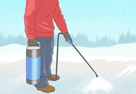 Use liquid magnesium chloride blend. Apply this chemical to the pavement or public space with a garden sprayer before the storm hits. It’s best to apply this a couple hours before a winter storm. The chemical will melt snowfalls that are less than two inches. It will also keep ice from adhering to hard surfaces like pavement or public spaces. You can also apply deicers during a snowfall after you’ve removed the first layer of snow. You should expect to use about 1 gallon of the chemical for every 1,000 square feet of pavement. You should be able to buy it at hardware stores. Chemicals can be very toxic to plants and animals. Follow all directions, and consider other methods if you have pets or expensive landscaping.