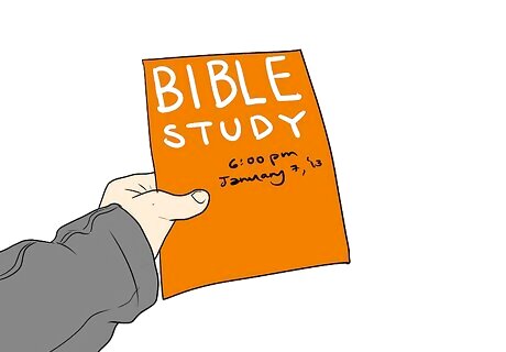 Create fliers for your Bible study session. Your fliers should inform those interested: where the sessions will be held, when the sessions will be held, a contact number, a brief schedule, and whether or not you will be providing Bibles, notebooks, pens, and folders for the Bible study.