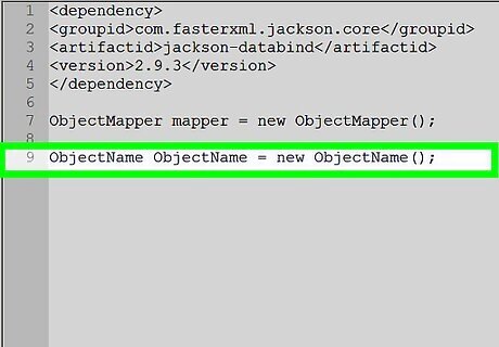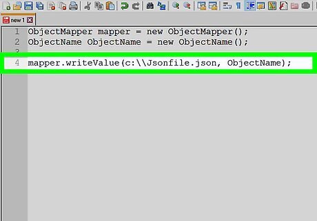 Type the object name. Type the following code. Type the actual name of the Java object that you convert to Json. For example, if the Java object is named "Student", the code would read Student Student = new Student(); ObjectName ObjectName = new ObjectName();