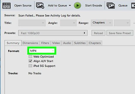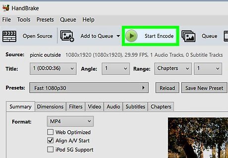 Click Start Encode. This green button is at the top of the HandBrake window. Clicking it prompts HandBrake to begin converting your WMV file into an MP4 file; once the conversion is complete, the MP4 version will appear under your specified name in the file location you selected. On a Mac, you'll just click Start here.