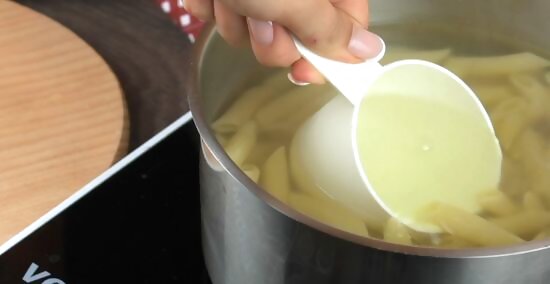 Set aside 1 cup (240 mL) of the boiling water if you are using a sauce. Gluten-free pasta absorbs a lot of liquid once it is cooked. Scoop out some of the boiling pasta water and set it aside to mix with whatever sauce you use to thin it out and make it more spreadable.Tip: Use a metal ladle to make scooping easier.