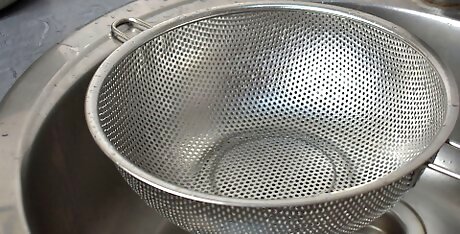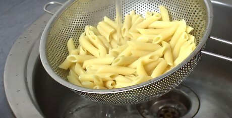 Set a metal or plastic colander in the sink. Clear your sink of any dishes and set your colander in a place that it will not tip over. Make sure the holes in your colander are smaller than your pasta pieces.