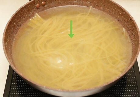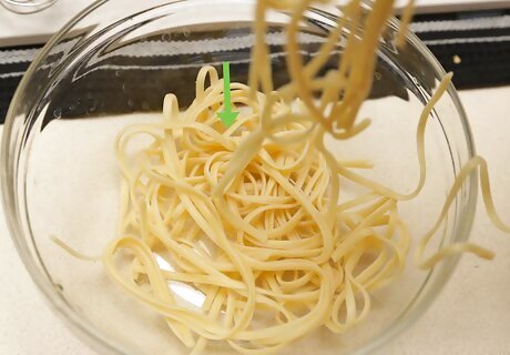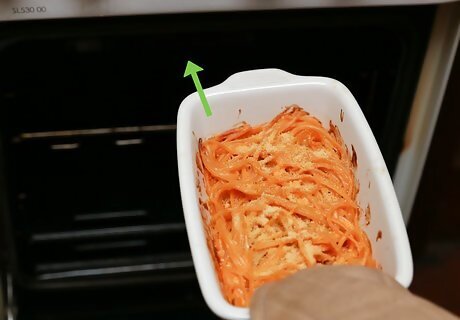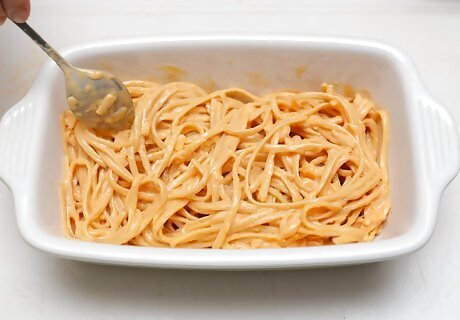 Pour the pasta mixture into a dish and bake it. Carefully pour all of your mixture into a 9x13 baking dish. Confirm that your oven is now heated to 350 degrees. Slide the baking dish into the oven and bake the pasta uncovered for 20-25 minutes. By that time, it will be hot and bubbly.