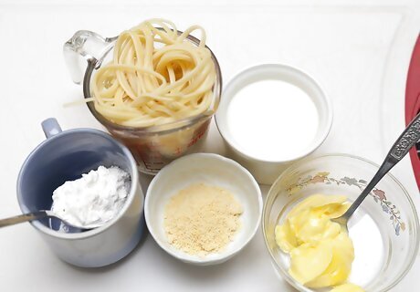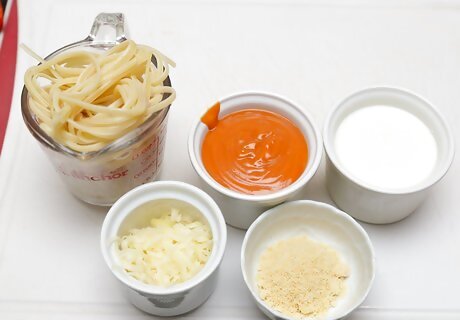 Gather the ingredients for the white sauce. You will make the white sauce immediately after you complete the red sauce. 1 tablespoon butter; 1 tablespoon flour; 1 ½ cups of milk or heavy cream; 1/2 cup of parmesan; 1 ½ cups of pasta of your choice (recommended are rotini, fusilli or a stuffed pasta.