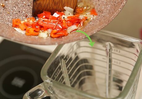 Remove the vegetables from heat and puree them. Transfer the vegetables from the skillet into a blender. Put the top on tightly and puree until the sauce is smooth. If the consistency of the sauce is thicker than you’d like, add a little olive oil while you’re blending. Once pureed, set it aside.
