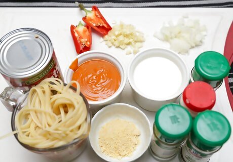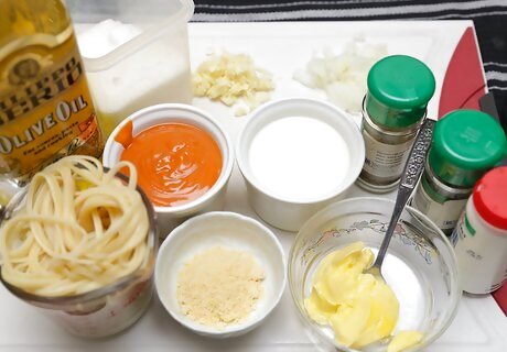 Gather the ingredients for the red sauce. You will make the red sauce first. Go ahead and grab the ingredients for both sauces, but keep the red sauce ingredients separated from the white. The overall prep time for the entire meal is approximately 30-40 minutes. Serves 2. 1 chopped red pepper; 1/8 of a sliced red onion; 1 small chopped tomato; Clove of garlic; Italian spices of your choice (recommended are basil, rosemary, and oregano); Pinch of salt & pepper;