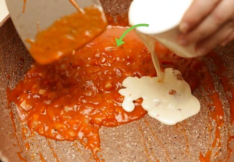 Remove the red sauce from heat and stir in the cream. To remove from heat, carefully slide your skillet over to an unused burner on your stove. Stir in 1 cup of heavy whipping cream. Add the cheeses (to taste). Dip a spoon in and taste a little to gauge the seasoning (add more, if needed).