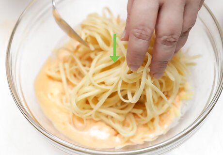 Add mozzarella cheese and drained pasta. Mix 2 cups of shredded mozzarella cheese into the sauce mixture in your large bowl. Stir the cheese into the sauce well. Then add the cooked and drained pasta to the mixture. Stir well to combine all of the ingredients.