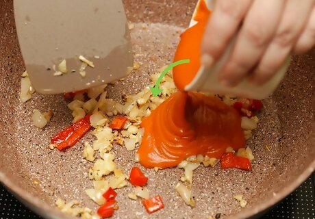 Heat 2 tablespoons of olive oil in a large skillet. Sauté the chopped red pepper, sliced red onion, chopped tomato and minced garlic in the skillet over medium heat. As you sauté, add the Italian spices you like best (recommended are basil, rosemary, and oregano), along with a pinch of both salt and pepper. Sauté for approximately 1 minute or so.