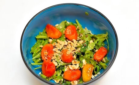 Combine the kumquats, arugula, hazelnuts, and mint together in a large bowl. Combine the cooked kumquats, 1/4 lb. of arugula, 3/4 cup of shelled, toasted, and crushed hazelnuts, and 1 handful of chopped mint.