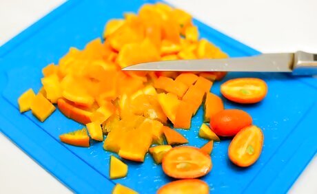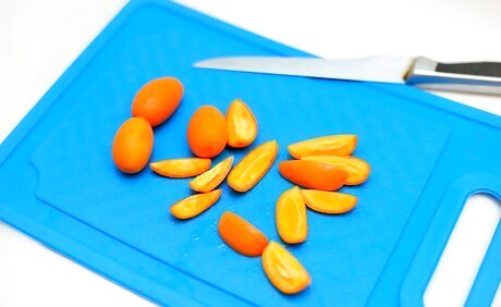 Chop 4 kumquats roughly with a paring knife. Discard any large seeds if you see them, but don't worry if some are chopped or remain in the fruit.
