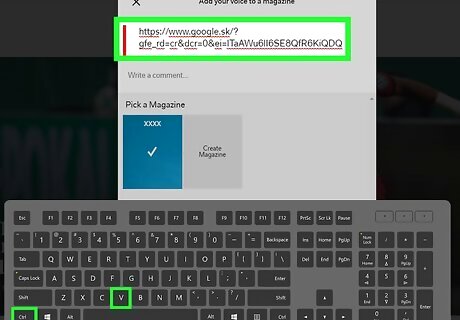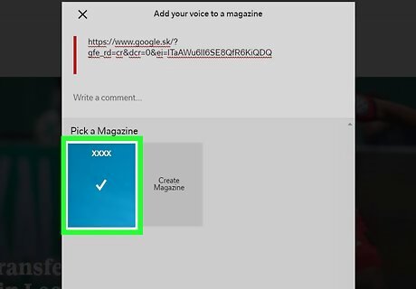 Paste the article link into the box. To do this, click the “Write a comment or add a website to your magazine” box, then press Ctrl+V to paste. If you’d like to add a comment to the article, type that into the box as well.
