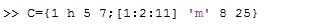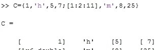 Create a cell array. A cell array is a rectangular set of data similar to a matrix but it can hold any type of data such as text, numbers, and/or vector. Code a cell array by listing a series of numbers, vectors, or characters in the same format as a matrix while characters are in quotation marks and vectors are in brackets. The cell array is surrounded by curly brackets { }. Hit enter once the code is completed. Example: C={1, ‘h’, 5, 7; [1:2:11], ‘m’, 8, 25} or C={1 ‘h’ 5 7; [1:2:11] ‘m’ 8 25}CellArray14.jpg CellArray15.jpg