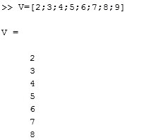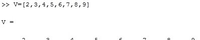 Create a horizontal vector. A vector is a set of numbers that are arranged in a single row or single column. Code a horizontal vector by listing a series of numbers in the vector that are separated by spaces or commas and surrounded by brackets. Hit enter once completed the code to display the vector. Example: V=[2,3,4,5,6,7,8,9] or V=[2 3 4 5 6 7 8 9]Vector6.jpg Vector7.jpg