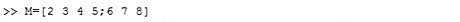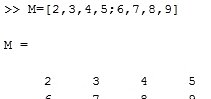 Create a matrix. A matrix is a rectangular set of numbers that are arranged in multiple rows and columns. Code a matrix by listing a series numbers separated by spaces or commas per row within the command window. For a new row, a semi colon is placed between the values of the old row and new row. The matrix is finished by surrounding it by brackets. Hit enter when finished to display the matrix. Example: M=[2,3,4,5;6,7,8,9] or M=[2 3 4 5;6 7 8 9]Matrix1.jpg Matlab.jpg