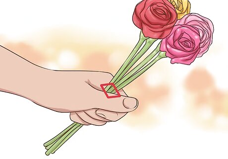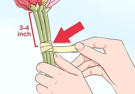 Secure the base. Once you've built as big a base as you want, you will need to secure it in place before continuing your bouquet. The flower stems should naturally join together about 3 to 4 inches from the flower heads. Use some floral tape to gently bind the stems together. Use another piece of floral time to bind the ends of the stems. About 2 inches from the ends of the stems, wrap the stems together with a piece of floral tape. If you're going to take a break before you continue with your bouquet, place the ends of the stems in water before proceeding.