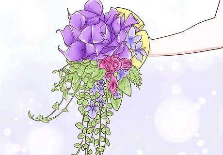 Try a cascade. A cascade is a kind of fun, bohemian style. If you're looking for a less traditional wedding, try going for a cascade style. The cascade has a waterfall feel. You anchor all the flowers around a base at the bottom, tying together their stems. From there, you let flowers hang looser than you would in a more traditional bouquet. The flowers spill out, resembling a tiny floral train.