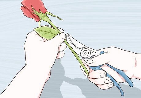 Prepare your flowers. Before you assemble your bouquet, you will have to trim your flowers and cut the stems. Use some floral shears to trim down your flowers, removing uneven or unwanted petals. Cut all the stems to the same length. If you're dealing with roses, remove any thorns. Trim off any damaged petals from your flowers. Trim all the stems so they're roughly the same length. This will help you as you form the base of your bouquet.