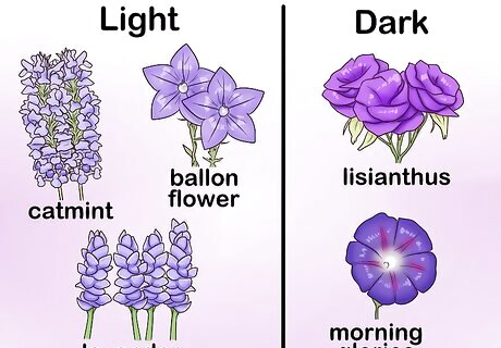 Choose dark or light purples. If you want a particularly light or dark bouquet, be aware of the flowers you're choosing. Some purple flowers are darker or lighter than others. Light purple flowers include things like lavender, catmint, and balloon flowers. Flowers like allium have a brighter look, which can compliment lighter colored flowers well. Orchids, which come in purple, tend to have darker leaves. Lisianthus flowers have darker colors towards the centers and look something like purple roses. Morning glories come in purple and have many dark marks on the petals.