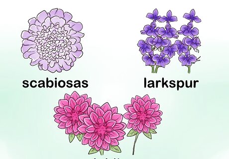 Keep your eye out for fall flowers. If you're going for a fall wedding, this can change your choices in flowers. Be on the lookout for attractive fall flowers that will make your bouquet a stunning shade of purple. Scabiosas come in shades of purple and bloom during the fall. Dahlias bloom in fall and come in shades of purple. Larkspur blooms in both fall and summer and comes in a dark shade of purple. While not purple, coxcomb come in crimson and burgundy shades that could potentially compliment a purple bouquet.