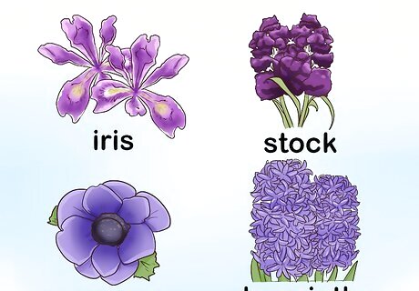 Seek out spring and summer flowers. If your wedding is going to be in spring or summer, don't limit yourself to year-round flowers. Seek out beautiful purple flowers that will be in season during your wedding. Irises come in a light shade of purple and peak during summer and spring. Stock are long flowers with clusters of petals blooming around the stem. They grow in spring and summer. Anemones are a great shade of dark purple and bloom during the spring. Hyacinths can be lavender or purple and bloom during spring.