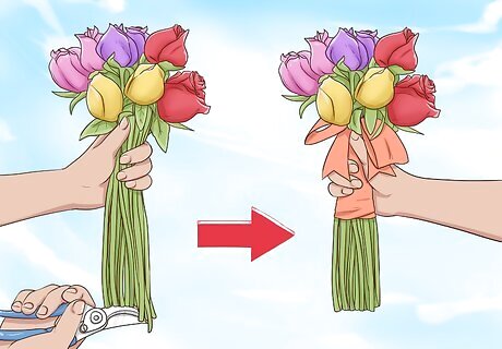 Secure the bouquet. When you're done with the bouquet depends on your personal preferences and the style you want to create. Once the bouquet is in the shape you want, and the size you want, you should secure it so it stays in shape leading up to your wedding day. Cut your stems so they're all the same length. You should have about 7 to 8 inches of stems at the bottom of the bouquet. Cut off a piece of ribbon. The ribbon should be about 3 times as long as the full length of the stems. Tuck one end of the ribbon into the stems near the flower heads. Wrap the ribbon around the full length of the flower stems. Then, secure the ribbon with a couple of pins. If you want a bow, cut out a separate piece of ribbon and tie it around the stems in a nice bow.