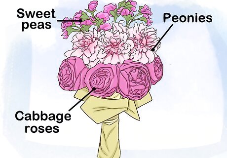 Consider a composite bouquet. A composite bouquet wires all the flowers around a single stem. Instead of bunching all the stems together, you would choose a thick stem. From there, you would wrap the other stems around the center stem. This makes your bouquet look like one giant flower.