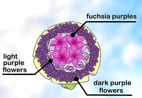 Use circles of different flowers. This can be fun if you're using many different types of flowers. You can create a design in which there are small circles of flowers of different colors. You can group light purples, dark purples, fuchsia purples, and so on to create a nice design with color.